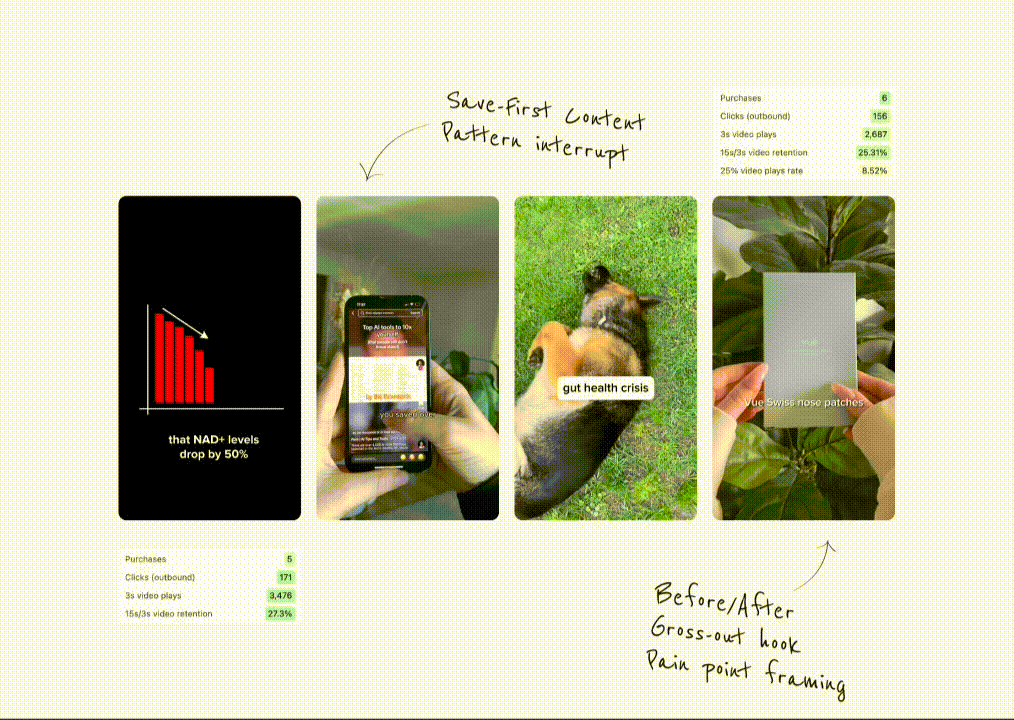 Every script follows Multiple Hooks → Body → CTAs structure engineered for watch time and keeps viewers past the 15-second mark through storytelling – not selling.